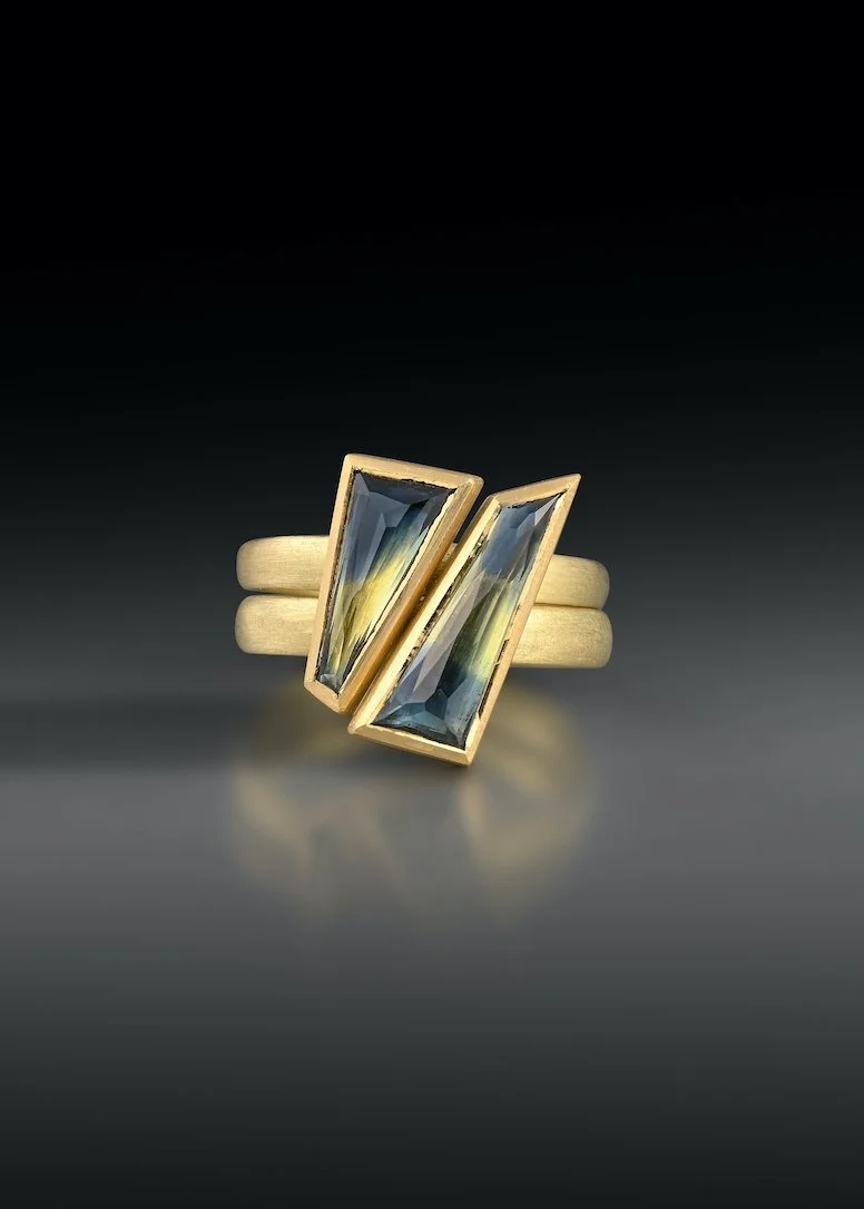 Unique Australian freeform parti sapphires, showing yellow, green and blue colours, faceted in Mark’s signature freeform trapezoid shape. The gemstones are set in 22ct yellow gold on an oval section 18ct gold band.
